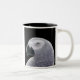 Conception originale de beaux-arts d'un perroquet de gris africain sur une tasse de café généreusement classée. Illustration par Carolyn McFann de studio de ronronnement de deux chats.