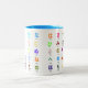 Tasse blanche avec chacun des 46 symboles japonais de hiragana. Prononciation dans l'alphabet au-dessous de chaque caractère.
