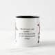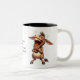 Tasse à café bicolore avec une inscription et des graphismes amusants.