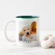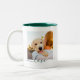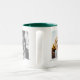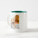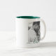 Vollständig anpassbarer personalisierter doppelseitiger 2-Fotoplatt und dunkelgrüner Kieferntext auf zweifarbiger Tasse.