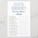 Dieses schöne Brautparty-Spielblatt mit Wie alt waren sie? vorne und Wie gut kennen Sie die Bride? hinten ist einfach und charmant - perfekt für Ihre Dusche. Diese lustigen und leichten Spiele bringen sicher viel Lachen in Ihr Brautparty! Lassen Sie sich von Familie und Freunden Bilder von Braut und Bräutigam aus allen Altersgruppen senden und drucken. Nummer sie und Set sie in der Nähe dieser Spielblätter. Geben Sie jedem Gast einfach ein Blatt (vergessen Sie nicht die Stifte) und ließ den Wettkampf für das erste Spiel! Sie werden erstaunt sein, wie viele Leute wirklich die Zeiten der Braut und des Bräutigams kennen. Dann dreh das Blatt und geben Sie den Gästen 5 Minuten, um die Fragen zu beantworten. Sie werden herausfinden, wer die Braut wirklich kennt. In Sekunden können Sie sehen, wie Ihr Spielblatt aussehen wird. Wählen Sie einfach diese Vorlage personalisieren und geben Sie die Namen der Braut und des Bräutigams ein.