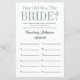 Dieses schöne Brautparty-Spielblatt mit Wie alt war die Braut? vorne und Wie gut kennen Sie die Braut? hinten ist einfach und charmant - perfekt für Ihre Dusche. Diese lustigen und leichten Spiele bringen sicher viel Lachen in Ihr Brautparty! Lassen Sie sich von Familie und Freunden Bilder von der Braut aus allen Altersgruppen senden und drucken. Nummer sie und Set sie in der Nähe dieser Spielblätter. Geben Sie jedem Gast einfach ein Blatt (vergessen Sie nicht die Stifte) und ließ den Wettkampf für das erste Spiel! Sie werden erstaunt sein, wie viele Leute wirklich die Zeiten der Braut kennen. Dann dreh das Blatt und geben Sie den Gästen 5 Minuten, um die Fragen zu beantworten. Sie werden herausfinden, wer die Braut wirklich kennt. In Sekunden können Sie sehen, wie Ihr Spielblatt aussehen wird. Wählen Sie einfach diese Vorlage personalisieren und geben Sie die Namen der Braut.und des Bräutigams ein.