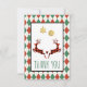 Une Carte de remerciements de Noël personnalisée sur le dos. Conçu avec une illustration de 2 cerfs de Noël sautant. Les cerfs sont faits de sériole rouge et noire, avec un peu de coeur entre eux. La décoration de noël de parties scintillant (faux) en or est accrochée au sommet. L'arrière - plan est un motif Jacquard rouge et vert.