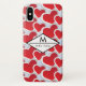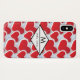 Ein Telefongehäuse mit personalisiertem Namen und erstmalig entworfen mit einem sich wiederholenden Muster von 2 verschiedenen roten Herzen jedes Herzens, umgeben von einem weißen Rand. Ein rautenförmiger Rahmen überlagert mit dem Text im Inneren.