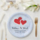 Papier Teller für eine Hochzeit oder ein Jubiläum mit einer Abbildung von zwei Papierherzen zusammengelegt - rot mit weißer Grenze. Set auf einem eleganten, eisblauen Marmorboden.