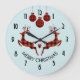 Eine Uhr, die "Frohe Weihnachten" in gebogenem Text sagt. Entworfen mit einer Illustration von 2 Weihnachtswildspringen. Hirsche sind kariert aus schwarzem und rotem Lumberjack, dazwischen liegt ein kleines Herz. Karierte Weihnachtsdekorationen in Rot und Schwarz hängen von oben ab.