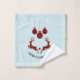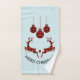 Ein Handtuch-Set, das "Frohe Weihnachten" in kurvigem Text sagt. Entworfen mit einer Illustration von 2 Weihnachtswildspringen. Hirsche sind kariert aus schwarzem und rotem Lumberjack, dazwischen liegt ein kleines Herz. Karierte Weihnachtsdekorationen in Rot und Schwarz hängen von oben ab. Hellblauer Hintergrund.