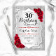 Einladung zum 30. Geburtstag. Elegantes Blumendesign in Silber und Rot. Enthält Imitate Glitzer silberne Streifen, rote Rosen stilvolle Skript-Schriftart und Konfetti. Ideal für eine gläserne Geburtstagsfeier.