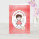 Niedliches Peitschmädchen mit Haaren, roten Brillen, Gingham-Kleid und Damenhalter auf einem roten und weißen Gingham-Muster zum 30. Geburtstag. Die Altersnummer kann geändert werden.