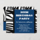 30e anniversaire ou toute année, bleu avec Zebra Swirl noir et blanc Invitations personnalisées, idéal pour 30e anniversaire ou toute année! Customisez cet invitation animal élégant avec vos nom, âge et informations de fête. Bleu super royal avec rayures zébrées noir et blanc.