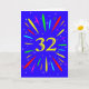 Eine explosive 32. Geburtstagskarte! Was für eine wunderbare Art, Geburtstagsgrüße zu schicken. Die Zahl 32 in hellgelb mit einer Explosion von hellen Farben und Sternen.