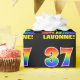 Dieses fröhliche, farbenfrohe und lustige Geburtstagsblatt-Design zeigt eine große Zahl "37" und die Meldung "HAPPY BIRTHDAY", beide mit einem inspirierten Regenbogenspektrum-Farbverlauf, zusammen mit einem kühnen gelben benutzerdefinierten Empfängernamen. Der Hintergrund ist schwarz. So ein Geburtstagsthema kann man bei Geschenken oder Geschenken zum 37. Geburtstag von jemandem verwenden. [~Z0000475]