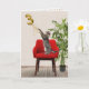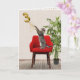 Graue Tischkatze, die mit Goldfolienballon und Bändern auf einem roten Stuhl zum 3. Geburtstag spielt. Der Insider-Text kann bearbeitet werden.