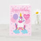 Ein bezauberndes Einhorn auf einem Regenbogen, umgeben von Ballons und Konfetti. Auf der Oberseite der Karte befinden sich die handgeschriebenen Worte "Happy Birthday", während der herzförmige Ballon die handgeschriebenen Worte "heute eins" hat. Eine perfekte Karte für den 3. Geburtstag eines Babys!