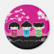 Drei niedliche japanische Puppen (Kokeshi), auf rosa Untergrund mit Kirschensorten-Blume