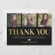 Modern graduation thank you cards featuring a stylish black background that can be changed to any color, 3 photos of the graduate, the words "thank you" in a formal gold font, a thank you note, and the grads name.