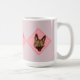 Genießen Sie Ihr Getränk der Wahl in dieser Tasse mit drei lächelnden Hirtengesichtern, die auf einem roten Diamantboden ruhen.