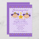 Conception adorable de princesse pour anniversaire de jumeaux le troisième comportant deux petites princesses mignonnes avec les couronnes pourpres de cheveux et d'or entourées par le pois. Un numéro 3 est sur une étoile de bougie d'anniversaire entre lui. Frontière crantée par pourpre. Personnalisable ! Perfectionnez pour leur anniversaire d'altesses troisième. Original de PinkInkArt !