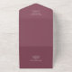Rose des Weins (Farbcode #894B5D) und weiße Typografie, nur Text, mit Monogramm, minimalistisch, einfache schlichte Hochzeitseinladung, die eine abreißende uAwg-Postkarte (3 in 1 je Bild) enthält. Element beinhaltet die Absenderadresse, eine Rücksendeadresse und Textvorlagenfelder für die Hochzeitsfeier und den Empfang nach Belieben (Text bearbeiten, um Ihre individuellen Bedürfnisse Anzug). Sie können auch Paare Initialen, Monogramm hinzufügen. Moderne und elegante, preisgünstige Einladung zum Anzug Ihrer Bedürfnisse.