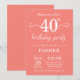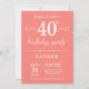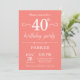 40. Geburtstag Einladung mit Korallenuntergrund. Erwachsener Geburtstag. Männer oder Frauen laden ein. 13. 15. 16. 18. 20. 21. 30. 40. 50. 60. 70. 80. 90. 100. Jegliches Alter. Für weitere Anpassungen klicken Sie bitte auf die Schaltfläche "Anpassen" und verwenden Sie unser Designwerkzeug, um diese Vorlage zu ändern.