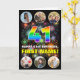Die Vorderseite dieses lustigen und optimistischen Geburtstagskarten-Designs zeigt eine große Zahl "41" mit einem farbenfrohen Regenbogenspektrum, inspiriert Farbverlaufsmuster, zusammen mit der Meldung "HAPPY 41st BIRTHDAY" und einem personalisierten Namen, auf einem Muster, das durch das Platzen farbiger Feuerwerke inspiriert wird. Oben und unten auf der Vorderseite sind Bilder, die individuell angepasst werden können, vielleicht mit Fotos der Familie und Freunde des Empfängers. Die Innenseite hat eine personalisierte Geburtstagsgrüßbotschaft, oder könnte gelöscht und leer verlassen werden, wenn eine Nachricht von Hand geschrieben werden soll. Eine spannende, personalisierte Geburtstagskarte wie diese könnte dazu verwendet werden, den einundvierzigsten Geburtstag von jemandem zu würdigen. (Fotografie © Storytree Studios, Stanford, CA.) [~Z000660]