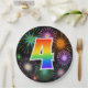 Diese farbenfrohe, fröhliche und lustige Papierplatte zeichnet sich durch eine große Zahl "4" aus, die ein inspiriertes Muster des Regenbogenspektrums enthält. Es zeichnet sich auch durch ein lebendiges und aufregendes Feuerwerk inspiriert. Der Hintergrund ist schwarz. Teller wie diese können bei einer Feier zum 4. Geburtstag, 4. Geburtstag oder 4. Geburtstag von jemandem verwendet werden. [~Z0000490]