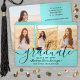 Teilen Sie die Freude eines High School oder Uni-Abschlusses mit diesen individuellen 4 Foto Collage aquamarine blaue und schwarze Ankündigungen. Alle Bilder und Texte sind einfach zu personalisieren. (IMAGE PLACEMENT TIP: Eine einfache Möglichkeit, ein Foto genau so zu zentrieren, wie Sie es gewollt haben, ist es, es einzuschneiden, bevor Sie es auf die Zazzle-Website hochladen.) Diese Vorlage ist einfach zu personalisieren mit beliebigen Details Ihrer Wahl, wie Party Einladung-Info, Eltern-Namen, Sonderehren, Studientitel, bevorzugten inspirierenden Zitat, Kontaktinformationen für Absolventen, zukünftige Bildungen oder neue Stellenangebote. Wenn ein Text nicht gewollt ist, löschen Sie ihn einfach. Das Design zeichnet sich durch einen aquamarin-türkisblauen, gebürsteten Hintergrund, eine schwarze Mörtel-Kappe, handgeschriebene Schrift-Kalligraphie, moderne minimalistische Typografie und vier Fotos Ihrer Wahl aus, wie Seniorbilder oder Bilder aus der Anlaufzeremonie. Bitte beachten Sie, dass der Hintergrund farbig und nicht metallisch ist.Diese eleganten Ankündigungskarten für Abschlüsse sind eine schicke und trendige Möglichkeit, Ihre Feier mit Freunden und der Familie zu teilen. Herzlichen Glückwunsch an den Absolventen!
