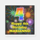 Dieses fröhliche und fröhliche Geburtstags-Thema Papier Serviette Design zeigt eine große Zahl "4" mit einem farbenfrohen Regenbogenspektrum inspirierte Muster, zusammen mit der Meldung "Happy 4th Birthday", und einem personalisierten Namen. Der Hintergrund zeichnet sich durch ein lebendiges und farbenfrohes Muster aus, das durch das Aussehen eines aufbrechenden Feuerwerks inspiriert wird. Farbenfrohe Papierservietten wie diese können bei einem Party zu Ehren von jemandem zum 4. Geburtstag Spaß machen. [~Z0000574]