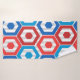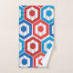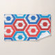 Ce kit de serviettes a un design géométrique 4 juillet d'hexagones en rouge et bleu sur un champ de rayures dans deux nuances de gris.