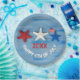 Starfish und amerikanische Flagge auf rustikal blauen Holz für 4. Juli Feier.