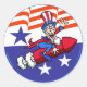 Zeigen Sie Ihren Patriotismus mit diesem 4. Juli Design mit Uncle Sam auf einer Rakete mit rotem, weißem und blauem Hintergrund.