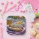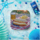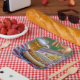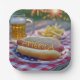 A hot dog with the word "America" written in mustard sits on a patriotic plate, accompanied by a mug of beer and a side of fries