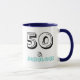 Célébrez un 50e anniversaire et une année de naissance avec cette 50 et fabuleuse tasse de café. Il a des poignées bleu foncé et est bleu foncé à l'intérieur, avec du texte en noir et bleu turquoise, sur un arrière - plan blanc. Le texte dit "50 & Fabulous". C'est un joli 50ème anniversaire de design pour célébrer le 50ème anniversaire ! Donnez-le comme cadeau ou obtenez-le pour vous-même. Certaines options peuvent être personnalisées / customisées.