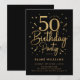 Einladung zur 50. Geburtstagsfeier in Schwarz und Gold. Moderne Gestaltung, perfekt für eine stilvolle Geburtstagsfeier für Männer oder Frauen. Enthält eine Schriftart und Konfetti. Anpassen mit Ihren eigenen Details. Gedruckte Zazzle-Einladungen oder sofort herunterladbare digitale Druckvorlage.