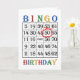 50. Geburtstagkarte. Sage einen Glückwunsch zum Geburtstag zu einem Bingo-Spieler mit einer Bingokarte. Das Alter ist rot eingekreist. Ein Bingo-verrückter Spieler bekommt einen Riesenkick aus dieser Karte! Copyright Norma Cornes.