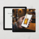 Die Hand eines Mannes hält ein Smartphone, das ein Bild einer Bierbläser-Tasse zeigt, während das Bier aus einer Flasche in die Tasse gegossen wird, was eine surreale Mischung aus Technologie und Realismus für eine 50. Geburtstagsfeier schafft. Alle Texte können geändert werden.
