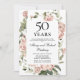 Das elegante 50. Hochzeitstag-Einladungsschema besticht durch einen modernen Blumenrahmen aus staubigen rosa Rosen und weichem grünem Blattwerk. Der gesamte Text ist bearbeitbar.