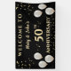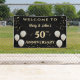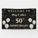 Eine 50. Goldene Hochzeitstag-Feier mit Hängebanner mit Paarnamen. Konzipiert mit weißen und goldenen Ballons auf schwarzem Hintergrund mit goldenen Konfetti. Der Text enthält: Willkommen zu, The Couple's First Names, und 50. Jubiläum. Um eine persönliche Note zu erhalten, ersetzen Sie einfach die Beispielnamen durch die Vornamen der Paare (Hinzufügen von 's).