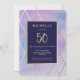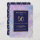 Cette invitation élégante et branchée à célébrer le 50e anniversaire peut être customisée pour vos occasions spéciales. Il présente un cadre doré et des lignes géométriques dorées dans le arrière - plan, ainsi qu'un lave-linge couleur couleur violet, rose et bleu peint à la main. Dans le cadre doré se trouve une boîte de arrière - plan bleu marine. "50" est dans une police de script stylée. Un invitation idéal pour un anniversaire de grande envergure.