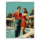 Vintages Bild der 50er Jahre mit einem charmanten Mann und einer Frau in einem kleinen roten Kleid, die sich am Pool amüsieren
