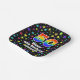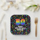 This cheerful and joyful birthday paper plate design features a large number “50” having a rainbow spectrum gradient inspired pattern. It also features the message “Happy 50th Birthday,”, and a custom name. The background features a vibrant and colorful pattern inspired by a field of stars. Exciting birthday themed paper plates like this might be used at a party in celebration of somebody’s fiftieth birthday. [~Z0000582]