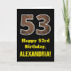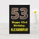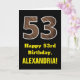 Dieses lustige, rustikale Geburtstagskartendesign mit einer großen Zahl "53" und einem inspirierten Aussehen aus Fake-Holzkorn auf der Vorderseite. Auf der Vorderseite steht auch die Geburtstagsgrüßbotschaft "Happy 53. Geburtstag" und ein personalisierter Empfängername. Im Inneren befindet sich eine personalisierte Geburtstagsgrüßbotschaft, oder man könnte sie löschen und leer verlassen werden, wenn eine Nachricht von Hand geschrieben werden soll. Eine personalisierte Geburtstagskarte wie diese könnte eine lustige Art sein, eine Botschaft zum Feiern des dreiundfünfzigsten Geburtstages von jemandem zu senden. [~Z0000433]