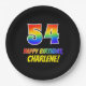 Dieses lustige, fröhliche und farbenfrohe Geburtstagsblatt-Design zeigt eine große Zahl "54" und die Meldung "HAPPY BIRTHDAY", beide mit einem Regenbogenspektrum inspirierte Musterfarbe, zusammen mit einem kühnen gelben individuelle Name. Der Hintergrund ist schwarz. Spaß, personalisierte Geburtstagsthemen-Teller wie diese könnten bei jemandem zum vierundfünfzigsten Geburtstag verwendet werden. [~Z0000488]