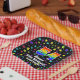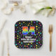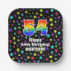 This cheerful and fun birthday themed paper plate design features a large number “54” having a rainbow spectrum gradient inspired pattern. It also features the message “Happy 54th Birthday,”, and a customizable name. The background features a multicolored pattern featuring many star shapes with different colors and sizes. Paper plates like this might be used when celebrating somebody’s 54th birthday. [~Z0000582]