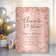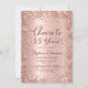 Feiern Sie stilvoll mit diesem modernen Rose Gold Glitzer "Cheers to 55 Years" Geburtstagseinladung. Dieses elegante und feminine Design besticht durch glänzende Details in der Rose mit vergoldeten Glitzer, eine anmutige Swash Schwanz Kalligraphie-Skript und einen sanften, rot-rosa metallischen Hintergrund. Ideal für eine glamouröse 55-köpfige Geburtstagsparty oder ein Meilenstein-Event - leicht anpassbar für eine 40., 50., 60., 70. oder sogar 80. Geburtstagsfeier.
