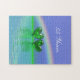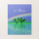 Dieses Puzzle ist eine lustige Geschenkidee und hat ein landschaftliches 3D-Bild von smaragdgrünen Herzen, die unter einem Regenbogen mit individualisierbarem Text auf dem Wasser schwimmen.