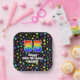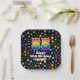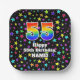 This vibrant and fun birthday-themed paper plate design features a large number “55” having a rainbow spectrum gradient inspired pattern. It also features the message “Happy 55th Birthday,”, and a customizable name. The background features a vibrant and colorful pattern featuring many star shapes with different colors and sizes. Joyful birthday themed paper plates like this might be used at a party for somebody who is celebrating their fifty fifth birthday. [~Z0000582]
