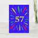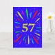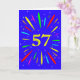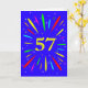 Eine explosive 57. Geburtstagskarte! Was für eine wunderbare Art, Geburtstagsgrüße zu schicken. Die Zahl 57 in hellgelb mit einer Explosion von hellen Farben und Sternen.