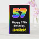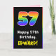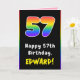 Dieses fröhliche und optimistische Geburtstagskarten-Design zeigt eine große Zahl "57" mit einem farbenfrohen Regenbogenspektrum, inspiriert Farbverlaufsmuster, mit der Meldung "Happy 57 th Birthday" und einem anpassbaren Empfängernamen. Im Inneren befindet sich eine individuell anpassbare Geburtstags-Grußnachricht, oder vielleicht kann gelöscht und links werden, wenn eine Nachricht von Hand geschrieben werden soll. Eine lustige, anpassbare Geburtstagskarte wie diese könnte eine lustige Art sein, jemandem, der seinen siebenundfünfzigsten Geburtstag feiert, Geburtstag zu schenken. [~Z0000627]