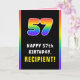Dieses lustige und fröhliche Geburtstagskarten-Design zeigt eine große Zahl "57" mit einem vielfarbigen Regenbogenspektrum, inspiriert Farbverlaufsmuster, mit der Meldung "HAPPY 57. BIRTHDAY" und einem personalisierten Empfängernamen. Im Inneren befindet sich eine individuell angepasste Geburtstagsgrüßbotschaft, oder man könnte sie löschen und leer verlassen werden, wenn eine Nachricht von Hand geschrieben werden soll. Eine fröhliche, anpassbare Geburtstagskarte wie diese kann dazu verwendet werden, jemandes siebenundfünfzigsten Geburtstag zu feiern. [~Z0000636]